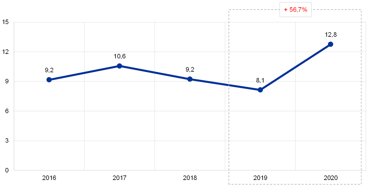 No final de 2020, o valor total das notas de euro em circulação ascendia a 1434,5 mil milhões de euros, o que corresponde a um aumento de 11% em comparação com o final de 2019. Ao BCE foi atribuída uma participação de 8% no valor total de notas de euro em circulação, a qual correspondia a 114,8 mil milhões de euros no final do ano. Dado que o BCE não emite notas de euro, detém créditos intra‑Eurosistema sobre os BCN da área do euro de montante correspondente ao valor das notas de euro em circulação.