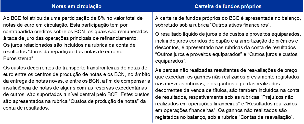 - Quando montantes em numerário depositados a título de garantia de operações de cedência de títulos permanecem por investir no final do exercício, as operações associadas são registadas em contas do balanço (ver a nota 9, “Outras responsabilidades para com instituições de crédito da área do euro expressas em euros”, e a nota 11, “Responsabilidades para com não residentes na área do euro expressas em euros”).