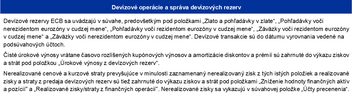 Poznámka: „Účty precenenia“ zahŕňajú celkové zisky z precenenia zlata, cudzej meny a cenných papierov, ale nepatrí sem účet precenenia v súvislosti s dávkami po skončení pracovného pomeru.