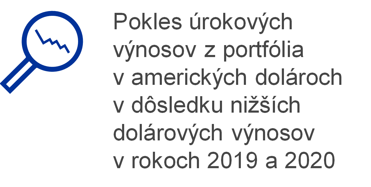 Čisté úrokové výnosy z devízových rezervných aktív klesli o 577 mil. € na 474 mil. €, najmä v dôsledku nižších úrokových výnosov z cenných papierov denominovaných v amerických dolároch. Vzhľadom na klesajúci trend výnosov dlhopisov v amerických dolároch počas väčšiny rokov 2019 a 2020 (graf 15), predovšetkým v prípade krátkych splatností, ECB nadobúdala cenné papiere s nižšími výnosmi, čím sa priemerná výnosnosť jej portfólia v amerických dolároch oproti minulému roku znížila. To malo záporný vplyv na úrokové výnosy z tohto portfólia počas roka 2020.