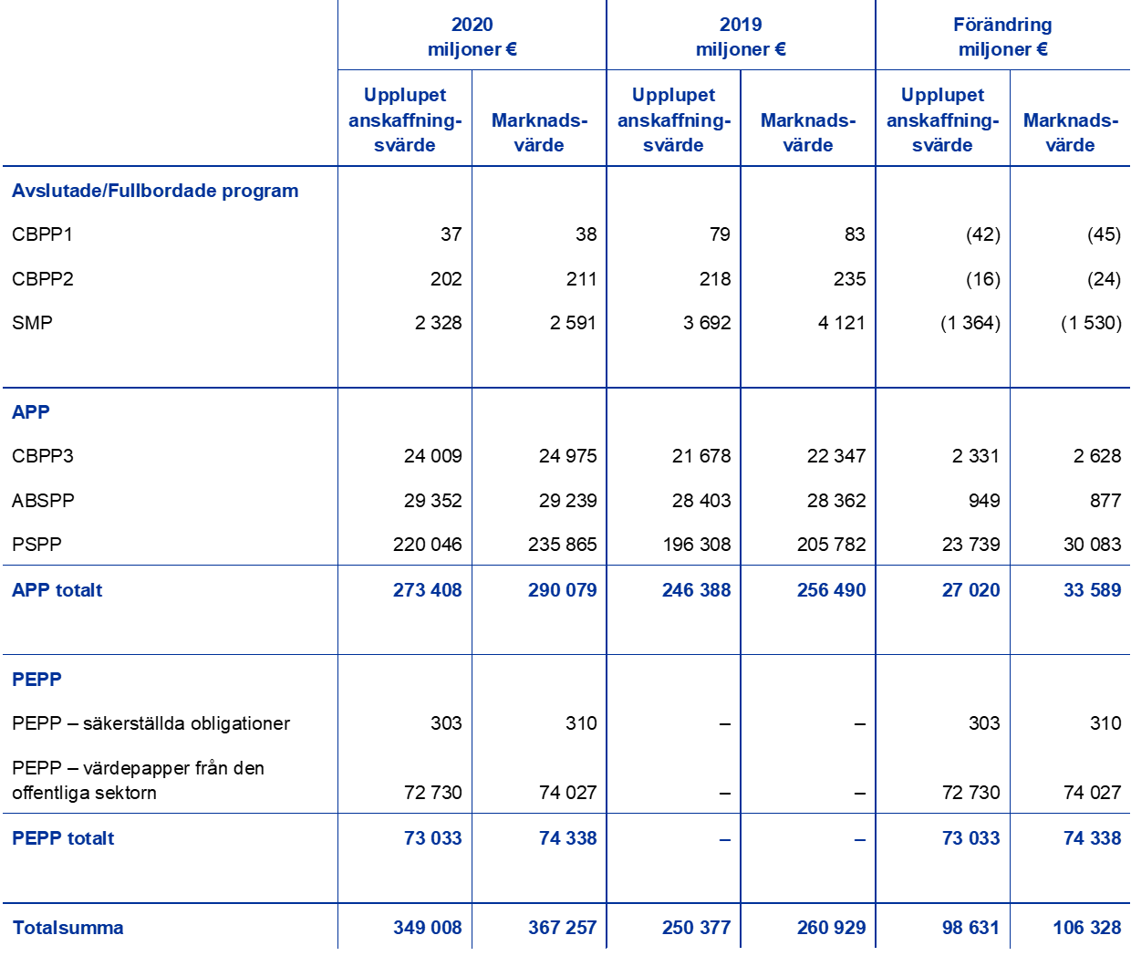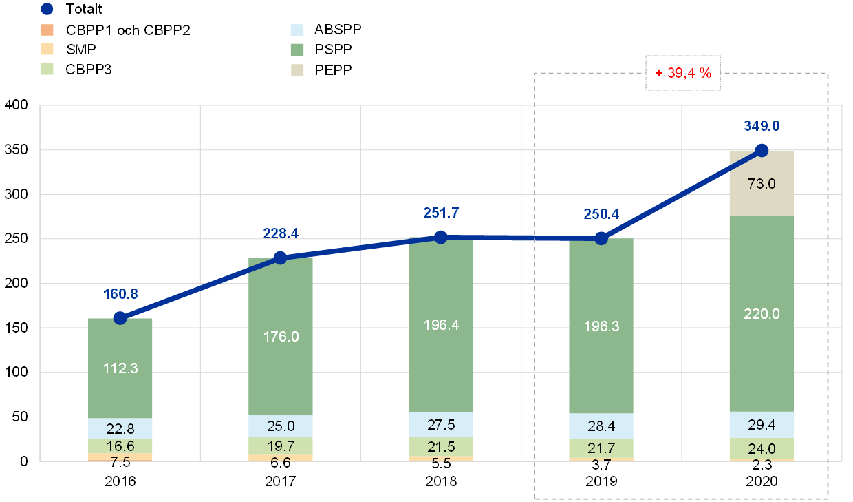 Under 2020 fattade ECB-rådet flera beslut om köp av värdepapper som innehas i penningpolitiska syften för att bemöta de allvarliga risker för den penningpolitiska transmissionsmekanismen och utsikterna för euroområdet som orsakas av covid-19-pandemin. I mars 2020 beslutade ECB-rådet bland annat att till den nuvarande månatliga förvärvstakten på 20 miljarder euro inom ramen för APP-programmet lägga till ett tillfälligt anslag på 120 miljarder euro för ytterligare köp av nettotillgångar fram till årets slut.[7] Senare samma månad beslutade ECB-rådet att lansera PEPP med ett första anslag på 750 miljarder euro fram till årets slut.[8] Som svar på utvecklingen av pandemin beslutade ECB-rådet i juni 2020 att öka PEPP-programmets ursprungliga anslag med 600 miljarder euro[9] och i december 2020[10] med ytterligare 500 miljarder euro, vilket innebär ett totalt anslag uppgår till 1,850 miljarder euro. ECB-rådet beslutade även att förlänga tidshorisonten för nettoköp inom PEPP-programmet till åtminstone slutet av mars 2022 och under alla förhållanden fram till dess att ECB-rådet bedömer att den akuta fasen av covid-19 krisen är över.