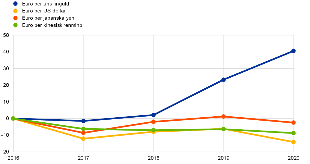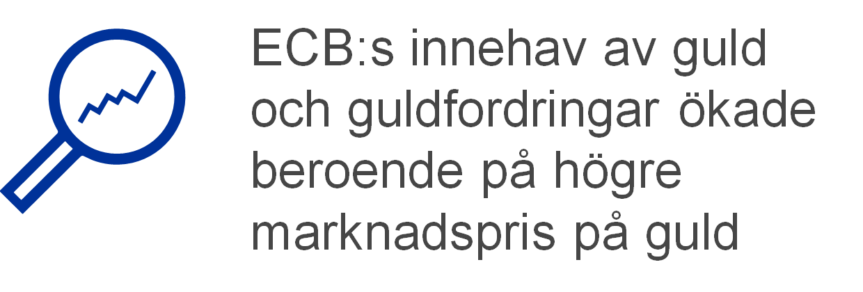 Beräknat i euro ökade ECB:s innehav av guld och guldfordringar 2020 med 3,1 miljarder euro till 25,1 miljarder euro (diagram 4) beroende på en ökning i marknadspriset på guld i eurotermer medan storleken på innehav i uns var oförändrad. Denna ökning ledde också till en motsvarande ökning av ECB:s värderegleringskonton för guld (se avsnitt 1.3.2 ”Finansiella resurser”).