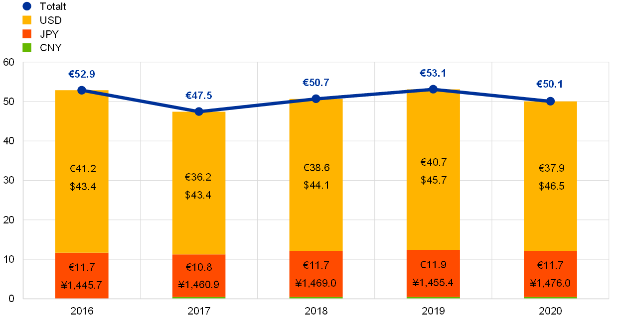 Under 2020 var det totala värdet i euro på ECB:s valutareservportfölj, som består av guld, särskilda dragningsrätter, US-dollar, japanska yen och kinesiska renminbi, i stort sett oförändrat på 75,8 miljarder euro.