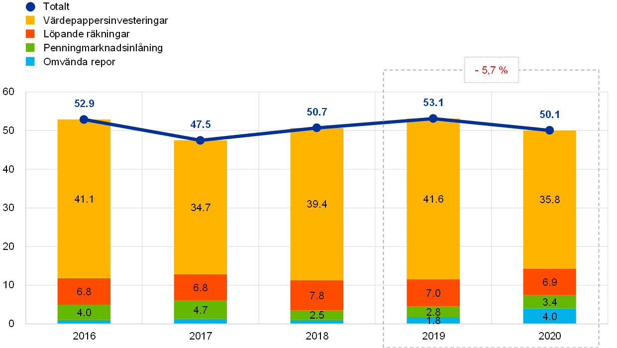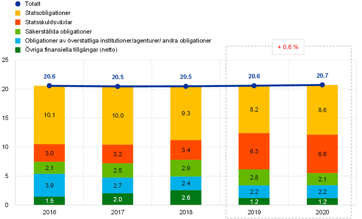 Under 2020 ökade värdet på portföljen för egna medel med 0,1 miljard euro till 20,7 miljarder euro (diagram 8), främst på grund av återinvestering av de genererade ränteintäkterna och ökningen av marknadsvärdet på de värdepapper som innehas i portföljen. Portföljen består huvudsakligen av värdepapper i euro som värderas till marknadspris vid årets slut. Under 2020 bestod portföljen till 73 procent av statspapper.