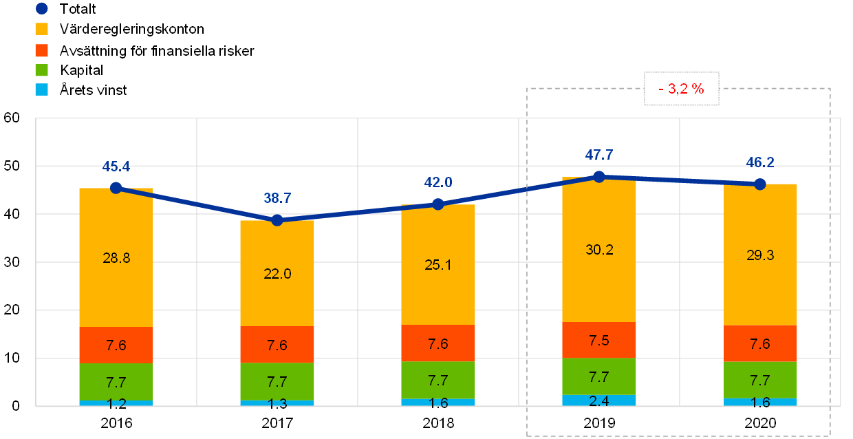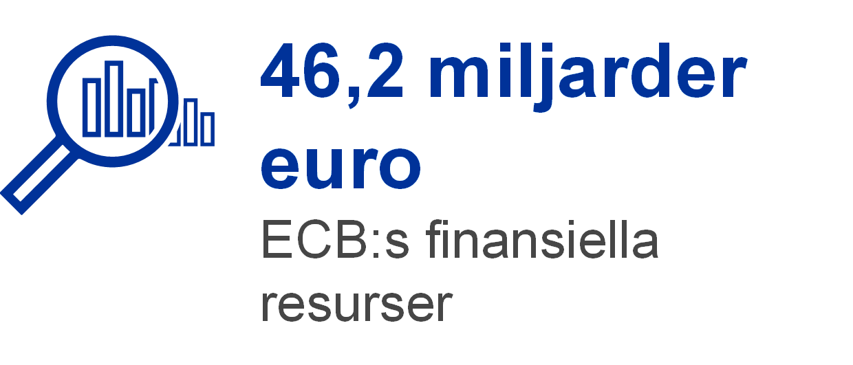 ECB:s finansiella resurser består av dess kapital, avsättning för finansiella risker, värderegleringskonton och årets vinst. Dessa finansiella resurser i) investeras i tillgångar som genererar intäkter och/eller ii) används för att direkt uppväga förluster som uppstår genom finansiella risker. Per den 31 december 2020 uppgick ECB:s finansiella resurser totalt till 46,2 miljarder euro (diagram 11). Detta var 1,5 miljarder euro lägre än 2019, främst på grund av i) minskningen av värderegleringskontona till följd av eurons appreciering gentemot US-dollarn och ii) den lägre vinsten 2020.