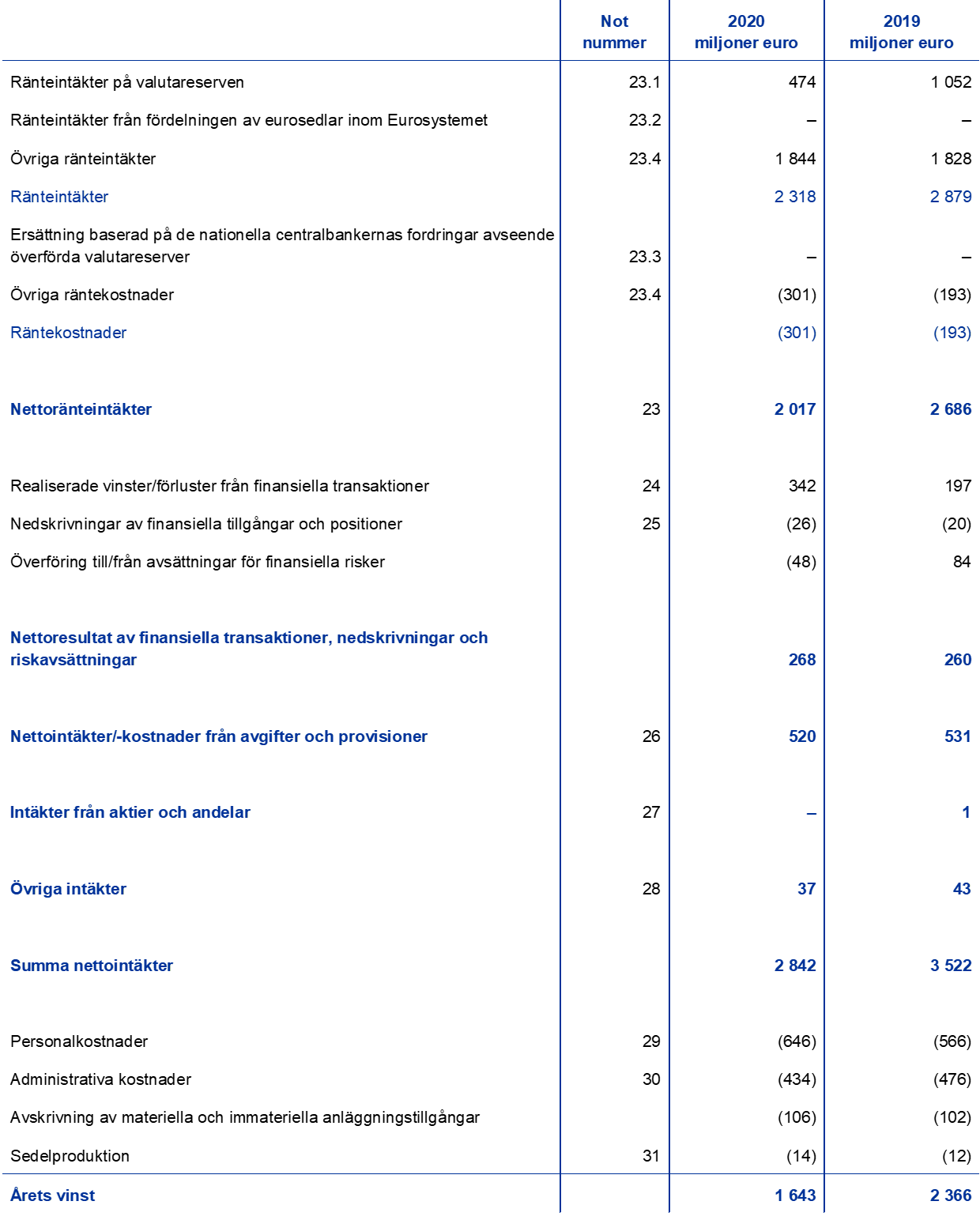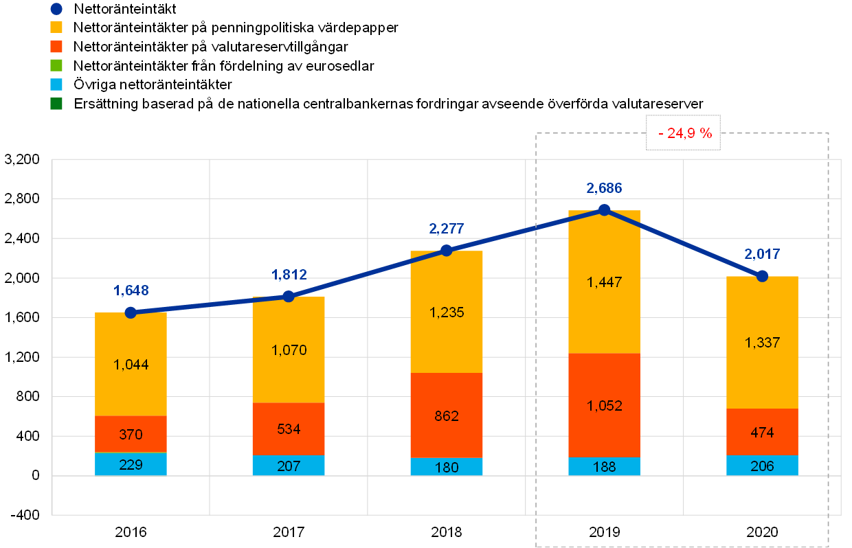 ECB:s vinst 2020 var 1 643 miljoner euro (2019: 2 366 miljoner euro). Minskningen på 722 miljoner euro jämfört med 2019 berodde främst på lägre nettoränteintäkter.
