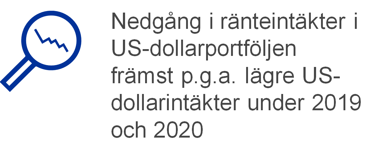 Nettoränteintäkter på valutareserven minskade med 577 miljoner euro till 474 miljoner euro, främst som resultat av lägre ränteintäkter på värdepapper i US-dollar. På grund av den trendmässiga minskningen av avkastning på värdepapper i US-dollar under större delen av 2019 och 2020 (diagram 15), speciellt för korta löptider, förvärvade ECB värdepapper med lägre avkastning, vilket ledde till att den genomsnittliga avkastningen på US-dollarportföljen blev lägre än året innan. Detta hade en negativ effekt på ränteintäkterna för denna portfölj under 2020.