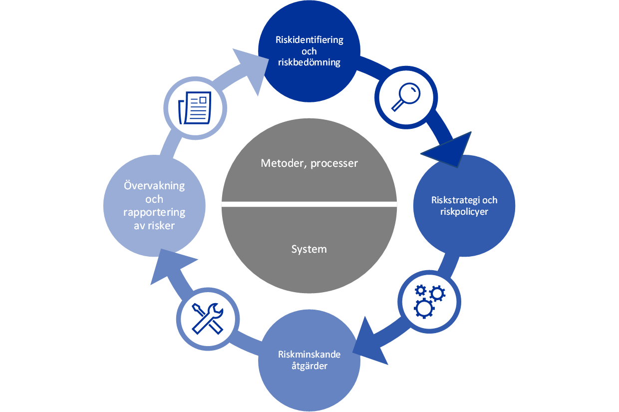 20. Operativ risk definieras som den risk för negativa finansiella, verksamhetsmässiga eller anseende som beror på personer, bristfälligt genomförande eller upphörande av den interna styrningen och verksamhetsprocesserna, stopp i system som processer är beroende av eller externa händelser (naturkatastrofer eller externa attacker).