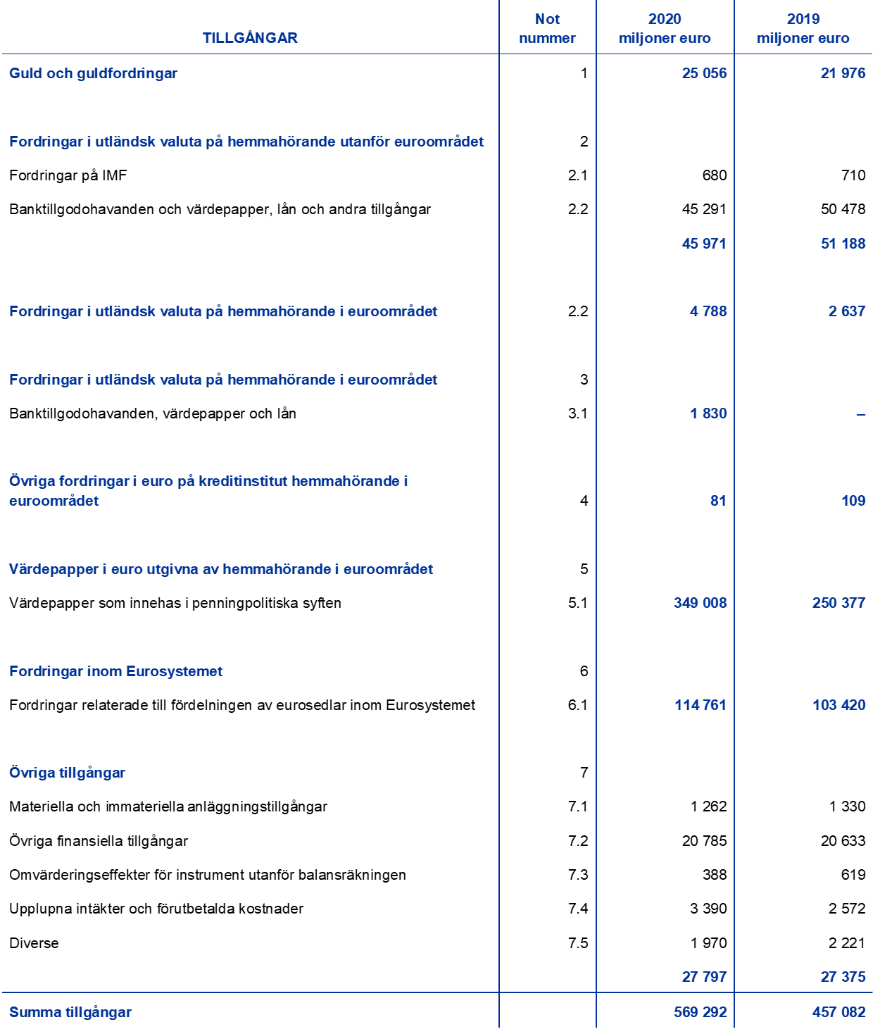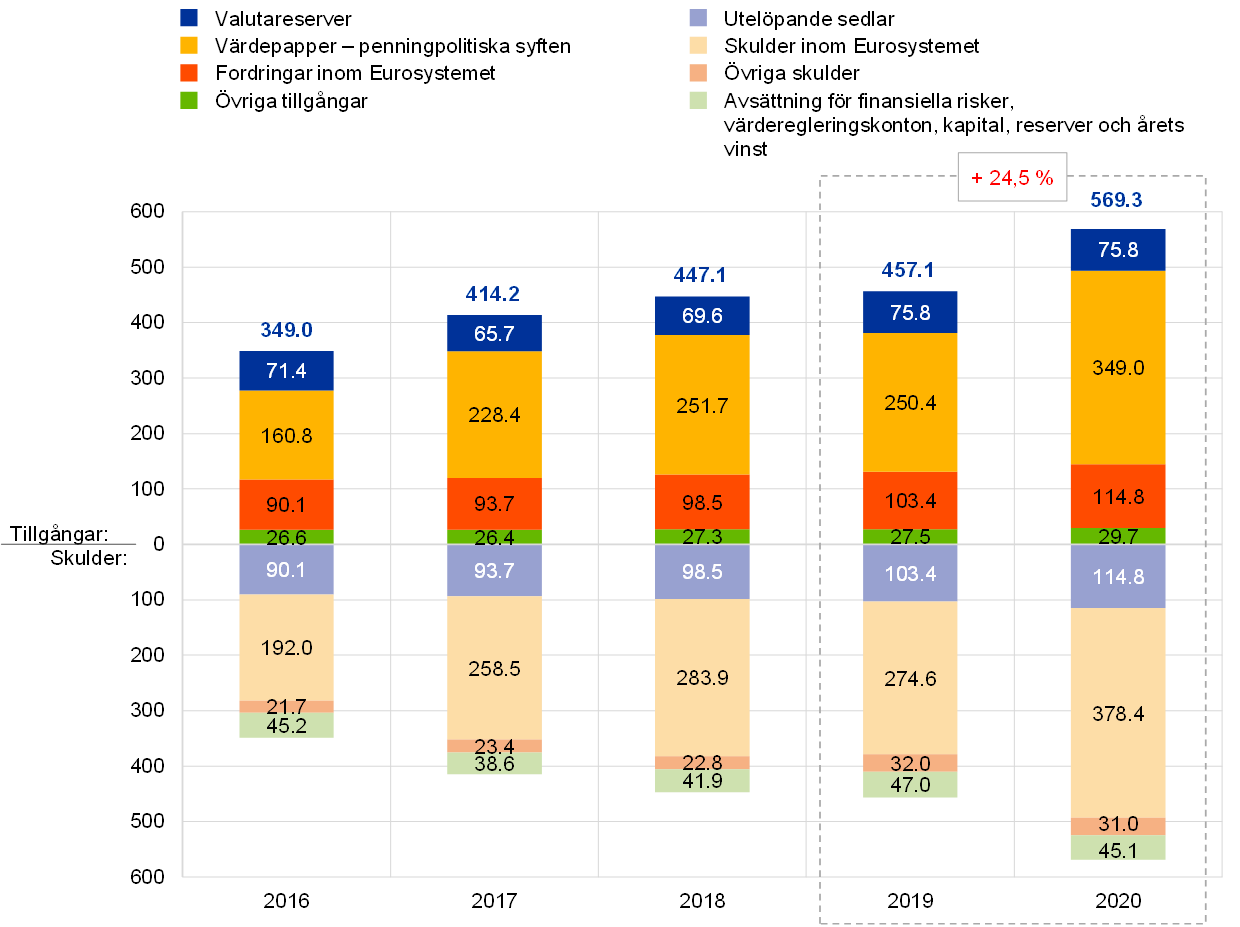 Under 2020 ökade ECB:s tillgångar totalt med 112,2 miljarder euro till 569,3 miljarder euro, främst beroende på dess andel av värdepappersköpen inom det nya PEPP-programmet (stödköpsprogram föranlett av pandemin)[6] och programmet för köp av tillgångar (APP). Dessa köp resulterade i en ökning i ”Värdepapper som innehas i penningpolitiska syften” medan kontantavvecklingen av dessa köp via Target2 ledde till en motsvarande ökning i ”Skulder inom Eurosystemet”. Ökningen i värde för utelöpande eurosedlar bidrog också till denna ökning.