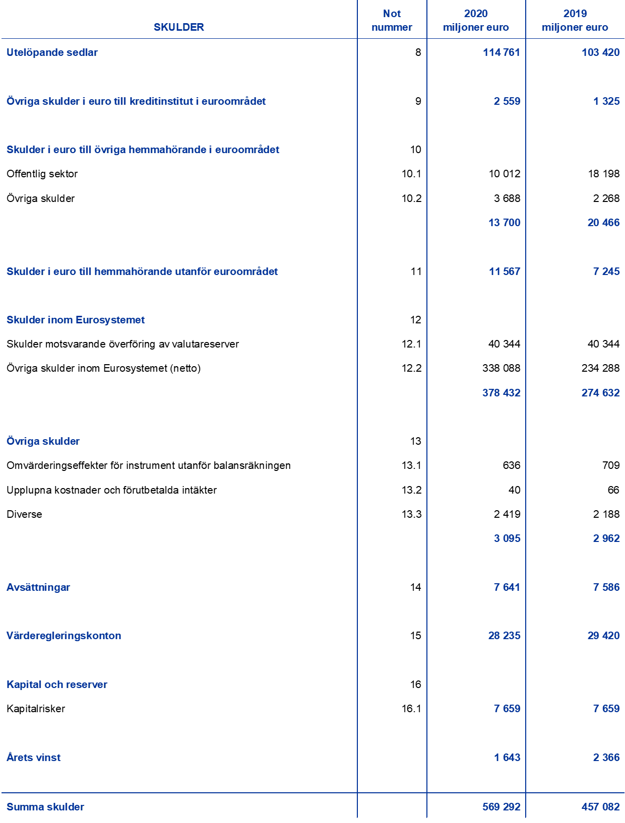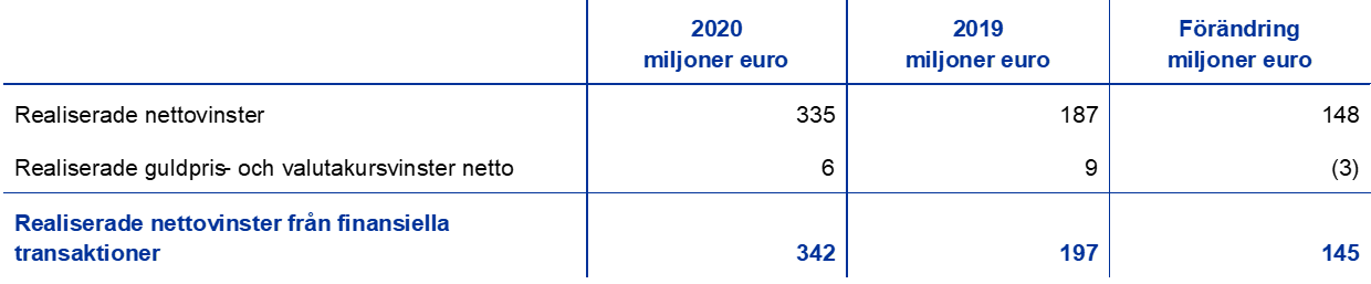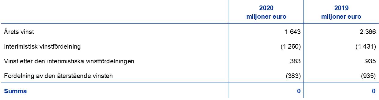 ECB:s nettovinst för 2020 var 1 643 miljoner euro. Efter beslut av ECB-rådet gjordes en interimistisk vinstfördelning på 1 260 miljoner euro som betalades ut till de nationella centralbankerna i euroområdet den 29 januari 2021. ECB-rådet beslutade dessutom att fördela återstoden av vinsten på 383 miljoner euro till de nationella centralbankerna i euroområdet.