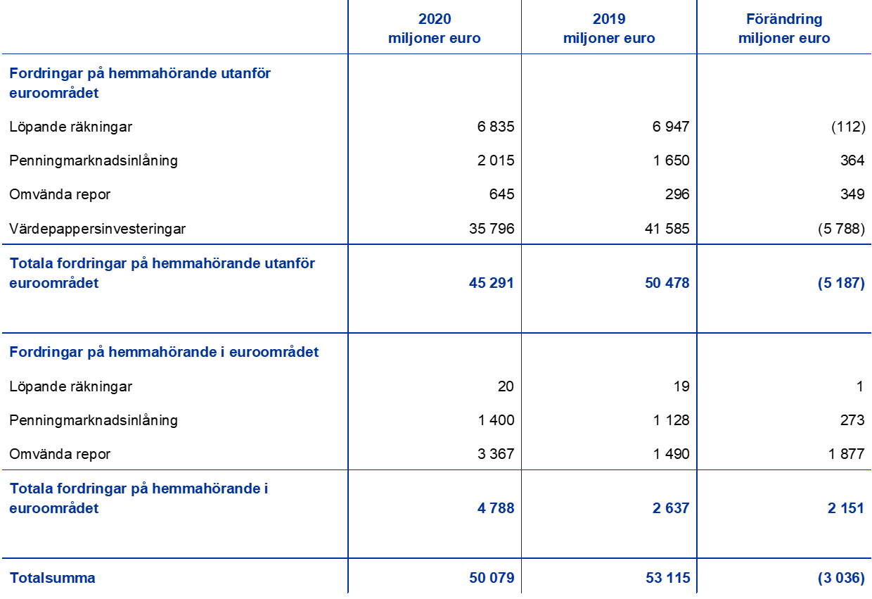 12. Dessa innehav omfattar tillgångar i ”Fordringar i utländsk valuta på hemmahörande utanför euroområdet – Banktillgodohavanden och värdepapper, lån och andra tillgångar, och ”Fordringar i utländsk valuta på hemmahörande i euroområdet”.