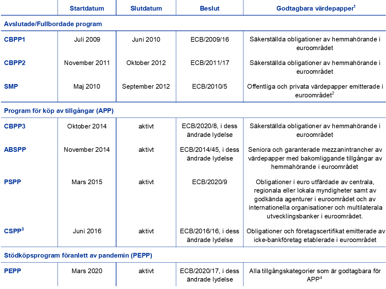 5. APP består av det tredje programmet för köp av säkerställda obligationer (CBPP3), programmet för köp av värdepapper med bakomliggande tillgångar (ABSPP), programmet för köp av offentliga värdepapper (PSPP) och programmet för köp inom företagssektorn (CSPP). ECB köper inte värdepapper inom ramen för CSPP. Mer information om APP finns på ECB:s webbplats.