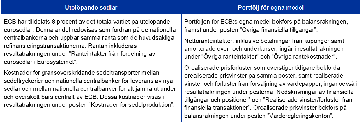 Eurosystemets penningpolitiska transaktioner redovisas i ECB:s och de nationella centralbankernas (NCB) årsredovisningar, vilket återspeglar principen om decentralisering av penningpolitikens genomförande i Eurosystemet. Tabell 1 nedan ger en översikt över ECB:s viktigaste transaktioner och funktioner för att uppfylla sitt mandat och visar hur dessa påverkar ECB:s årsredovisning.