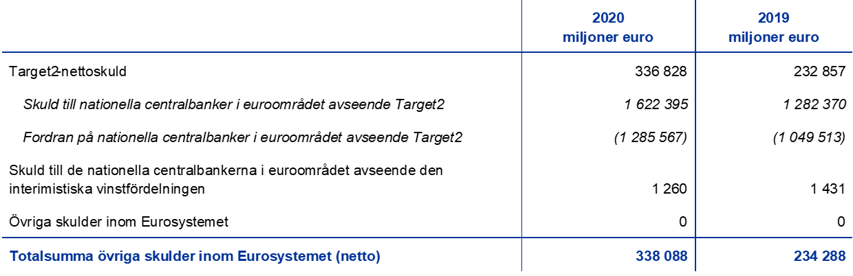 ECB:s skulder inom Eurosystemet, som huvudsakligen innefattar de nationella centralbankernas netto TARGET2-saldon gentemot ECB samt ECB:s skulder för de reservtillgångar som överförts till ECB av de nationella centralbankerna i euroområdet när de anslöt sig till Eurosystemet, ökade med 103,8 miljarder euro till 378,4 miljarder euro i slutet av 2020. Ökningen av skulder inom Eurosystemet under 2020 samt dess utveckling under perioden 2016-2019 drevs främst av utvecklingen av nettoskulden i TARGET2. Detta är resultatet av att ECB:s nettoköp av värdepapper för penningpolitiska syften avvecklas via TARGET2-konton (diagram 10).