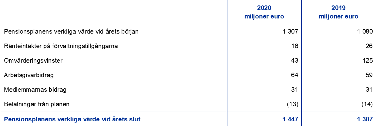 43. Den angivna förmånspelaren i planen återspeglar endast det obligatoriska bidraget från ECB och personalen. Frivilliga inbetalningar av personalen till ett avgränsat pensionsbidragssystem uppgick 2020 till 186 miljoner euro (2019: 171 miljoner euro). Dessa bidrag investeras i fondtillgångarna och leder till ett motsvarande åtagande av samma värde.