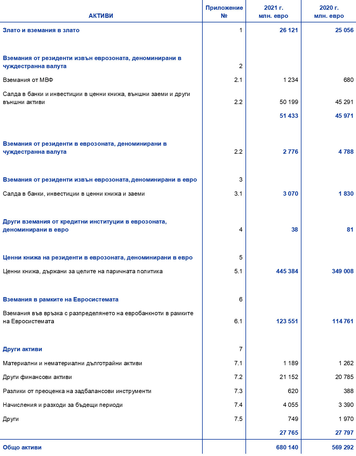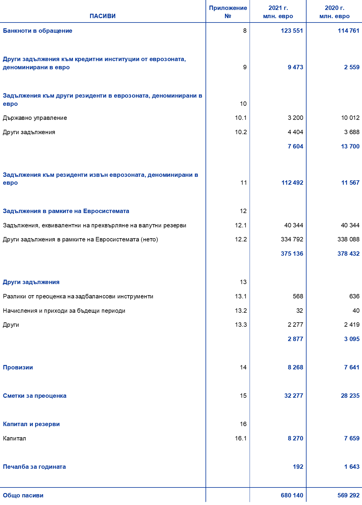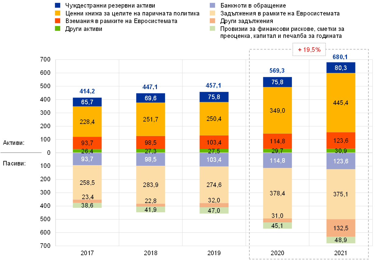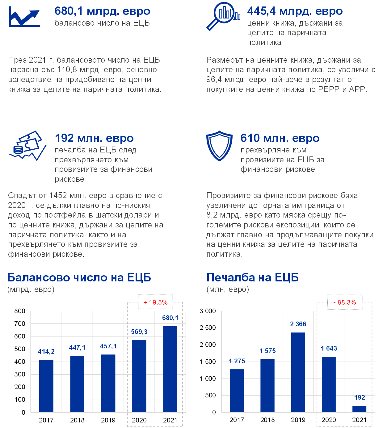 През 2021 г. балансовото число на ЕЦБ е нараснало със 110,8 млрд. евро до 680,1 млрд. евро, главно поради нейния дял в покупките на ценни книжа по PEPP и по APP. Тези покупки доведоха до увеличение на ценните книжа, държани за целите на паричната политика, а паричният сетълмент на покупките посредством сметки в TARGET2 доведе до съответно нарастване на задълженията в рамките на Евросистемата. Това нарастване беше напълно компенсирано от паричните средства, получени от клиенти на ЕЦБ извън еврозоната в TAREGT2, което доведе и до увеличение на другите задължения.