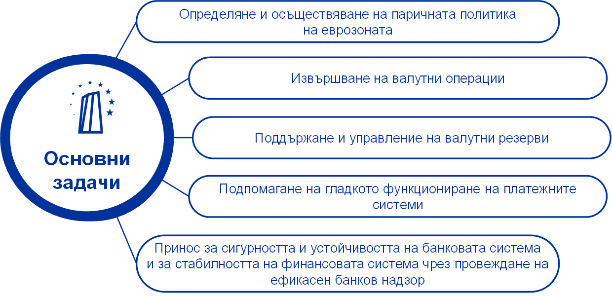 ЕЦБ е част от Евросистемата, която обхваща и 19-те национални централни банки (НЦБ) на държавите членки на Европейския съюз (ЕС), чиято валута е еврото. Първостепенната цел на Евросистемата е да поддържа ценова стабилност.[3] ЕЦБ изпълнява задачите си, както са посочени в Договора за функционирането на Европейския съюз[4] и в Устава на Европейската система на централните банки и на Европейската централна банка (Устав на ЕСЦБ)[5] (Диаграма 1). ЕЦБ извършва дейностите си с цел да изпълни своя мандат, а не с намерение да генерира печалба.