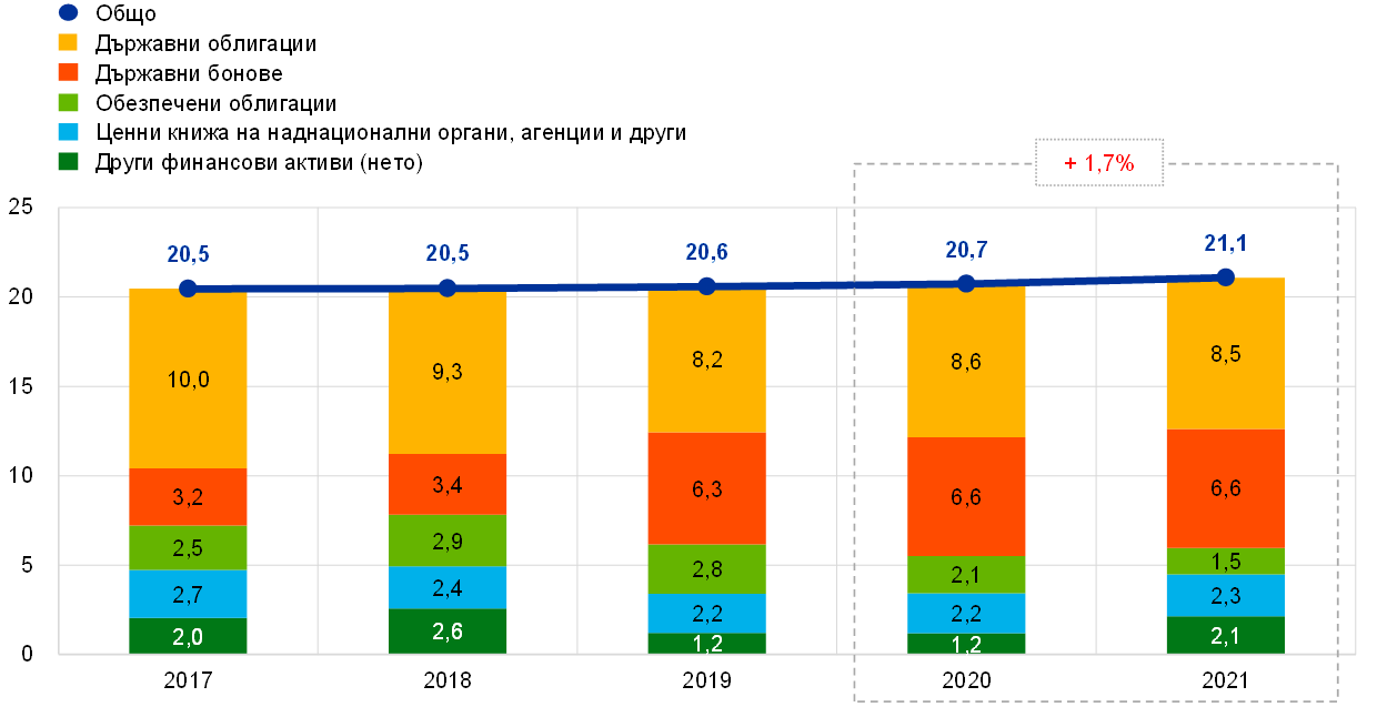 През 2021 г. стойността на портфейла от собствени средства нарасна с 0,4 млрд. евро до 21,1 млрд. евро (Графика 8) предимно вследствие на инвестирането на сумите, изплатени през 2021 г. от НЦБ от еврозоната по първия транш на увеличеното им участие в капитала на ЕЦБ след оттеглянето на Bank of England от ЕСЦБ (вижте раздел 1.3.2 „Финансови ресурси“). Това нарастване се компенсира частично, главно от спада в пазарната стойност на ценните книжа, държани в портфейла от собствени средства.