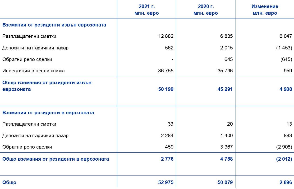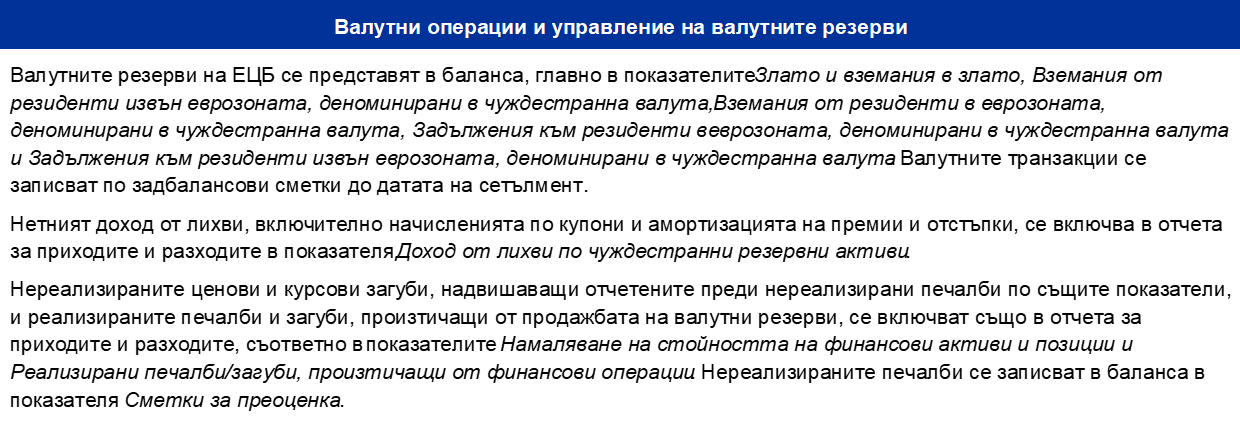 - Тези наличности се състоят от активи, включени в балансовите показатели Вземания от резиденти извън еврозоната, деноминирани в чуждестранна валута – Салда в банки и инвестиции в ценни книжа, външни заеми и други външни активи и Вземания от резиденти в еврозоната, деноминирани в чуждестранна валута.