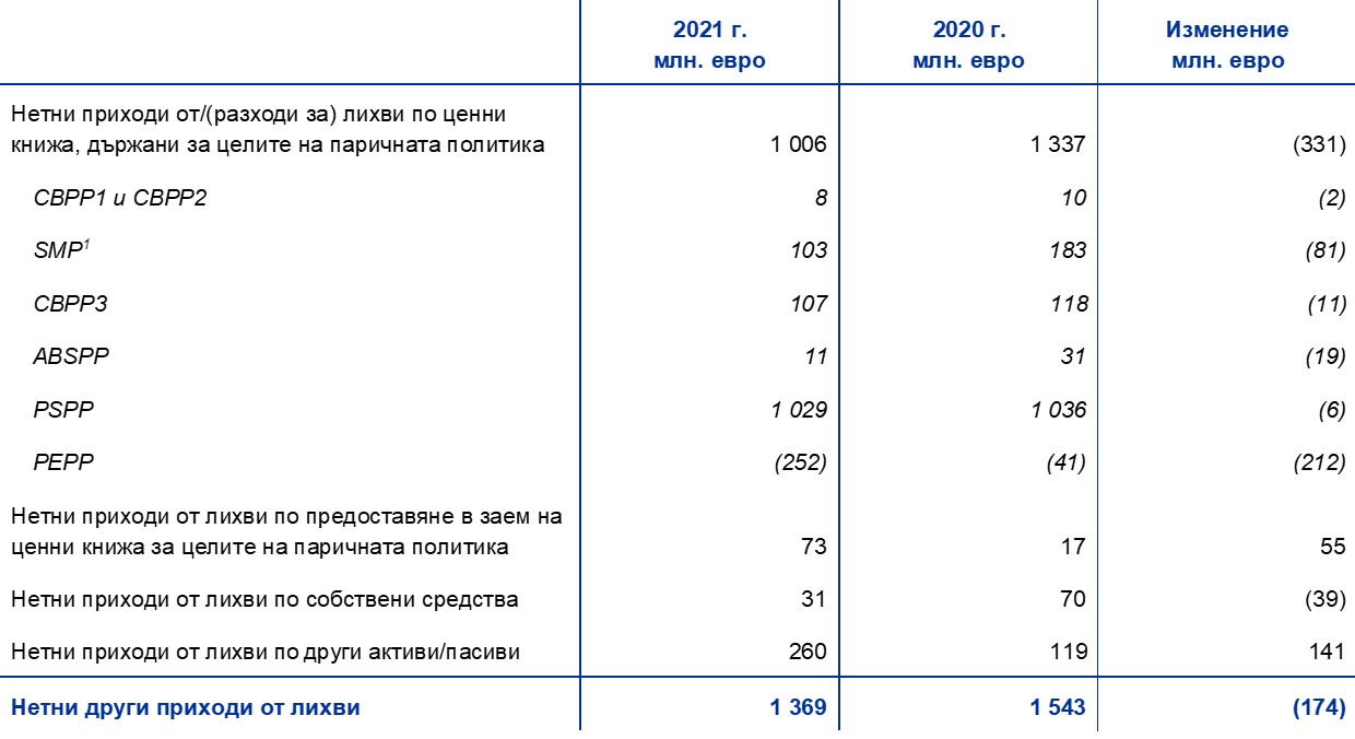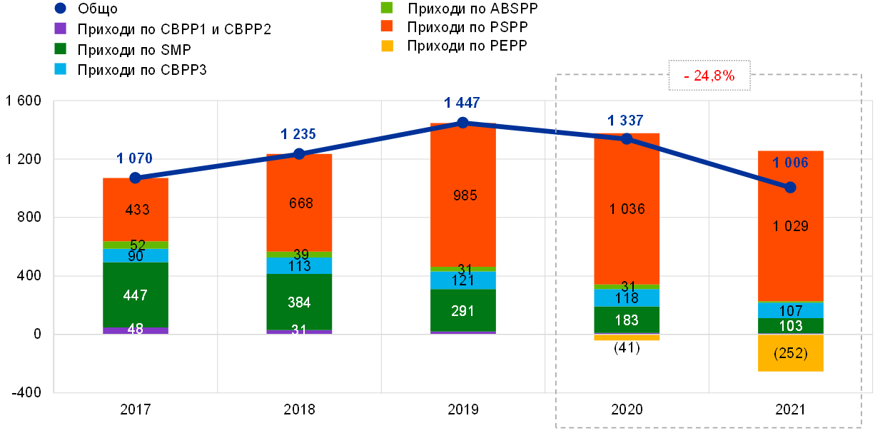 През 2021 г. ценните книжа, държани за целите на паричната политика, генерираха 64% от нетния доход от лихви на ЕЦБ.