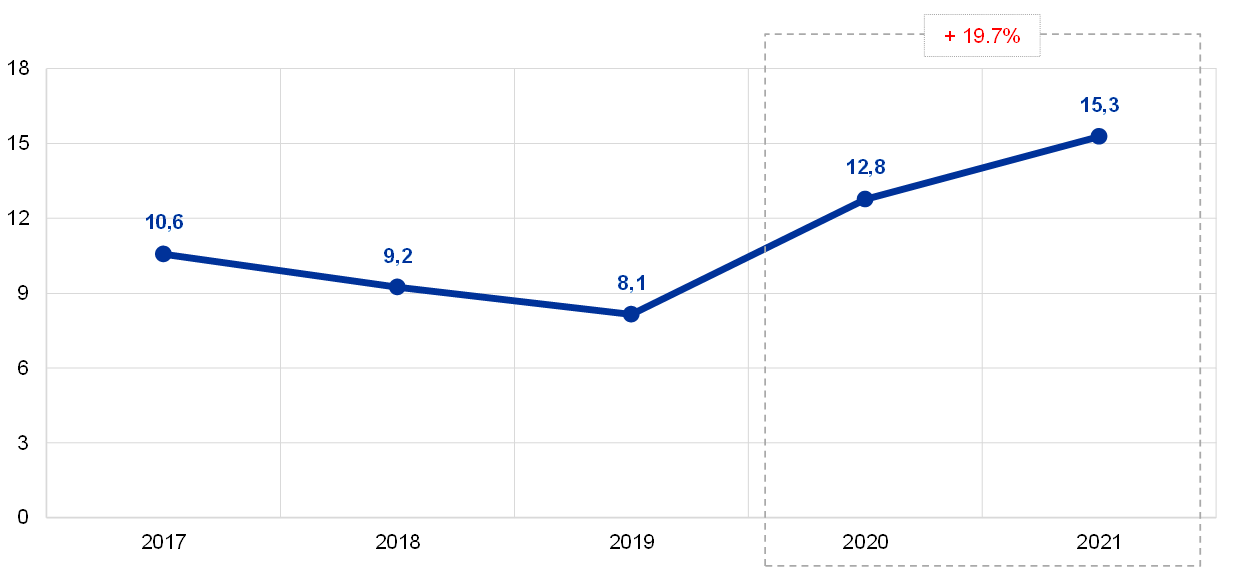 В края на 2021 г. общата стойност на евробанкнотите в обращение е 1544,4 млрд. евро – с 8% повече спрямо края на 2020 г. ЕЦБ има дял от 8% от общата стойност на евробанкнотите в обращение. Това се равнява на 123,6 млрд. евро в края на годината. Тъй като самата ЕЦБ не емитира банкноти, тя има вземания в рамките на Евросистемата от НЦБ от еврозоната на стойност, равна на стойността на евробанкнотите в обращение.