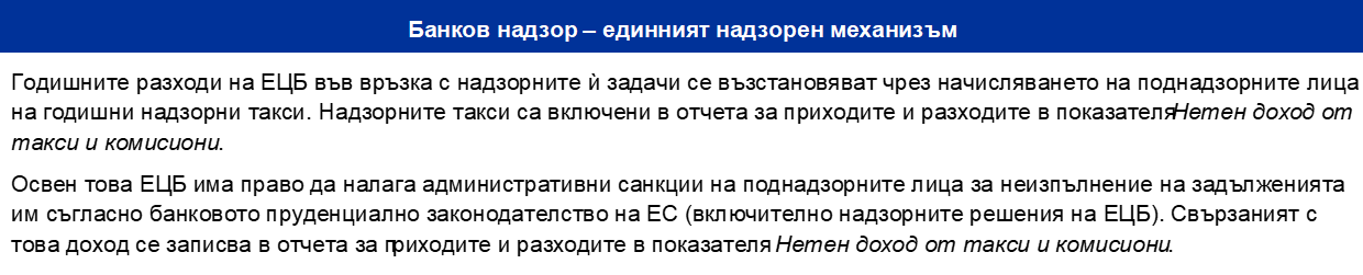 - Разходите на ЕЦБ по изпълнението на надзорните ѝ задачи се възстановяват чрез начисляване на поднадзорните лица на годишни надзорни такси. Повече подробности можете да намерите на уебсайта на банковия надзор в ЕЦБ.