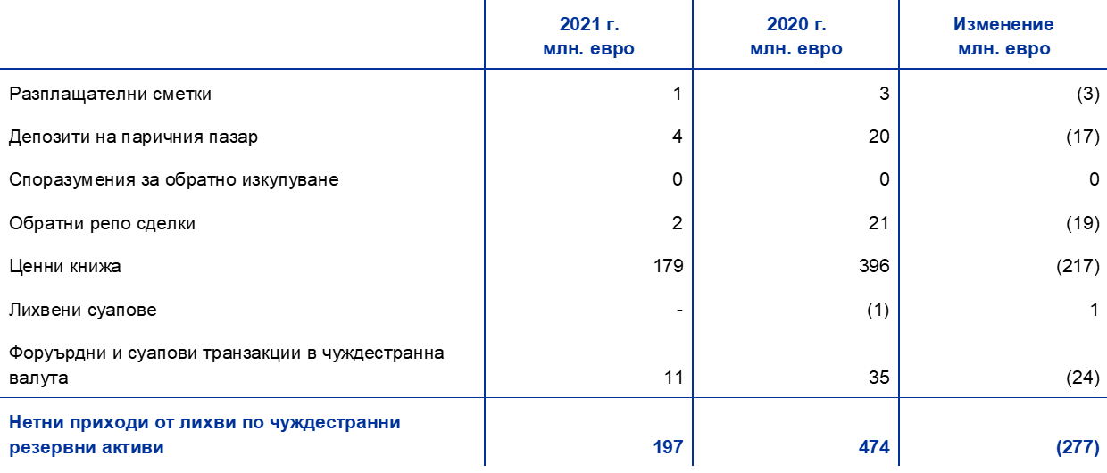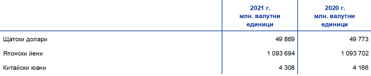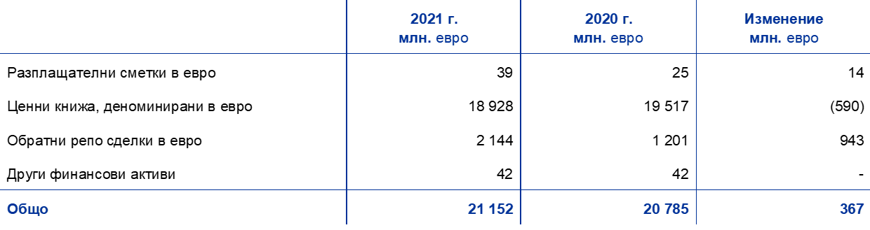 През 2021 г. общата равностойност в евро на чуждестранните резервни активи на ЕЦБ, които се състоят от злато, специални права на тираж, щатски долари, японски йени и китайски юани, се увеличи с 4,5 млрд. евро до 80,3 млрд. евро.