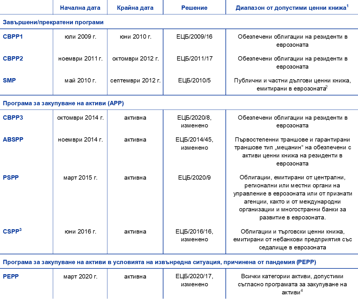 - Програмата за закупуване на активи (APP) се състои от третата програма за закупуване на обезпечени облигации (CBPP3), програмата за закупуване на обезпечени с активи ценни книжа (ABSPP), програмата за закупуване на активи на публичния сектор (PSPP) и програмата за закупуване от корпоративния сектор (CSPP). ЕЦБ не придобива ценни книжа по програмата за закупуване от корпоративния сектор. Повече подробности за програмата за закупуване на активи можете да намерите на уебсайта на ЕЦБ.