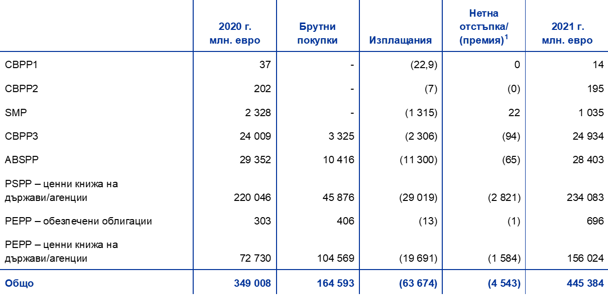 През 2021 г., въз основа на съответните решения на Управителния съвет, ЕЦБ продължи нетните си покупки на ценни книжа по APP и PEPP, включително реинвестирането на погашения по главници от ценни книжа с настъпващ падеж, придобити по тези програми. В резултат от тези покупки портфейлът от ценни книжа, държани от ЕЦБ за целите на паричната политика, нарасна с 96,4 млрд. евро до 445,4 млрд. евро (Графика 2), като увеличението се дължи главно на покупките по PEPP. Намалението с 1,3 млрд. евро на наличностите по SMP, CBPP1 и CBPP2 се дължи на изплащания.