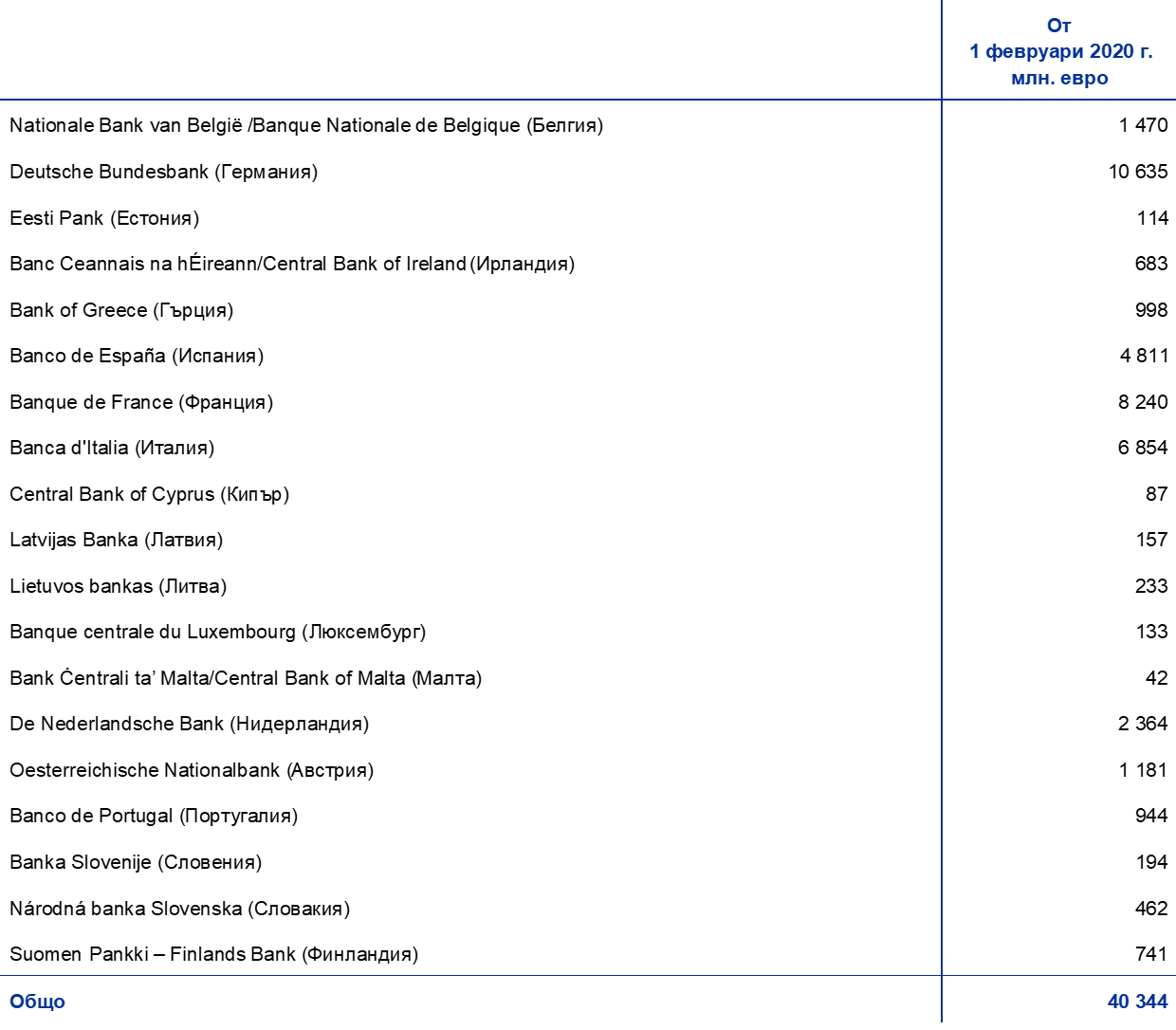 - Вижте прессъобщението от 30 януари 2020 г. относно записания капитал на ЕЦБ след оттеглянето на Bank of England от ЕСЦБ.
