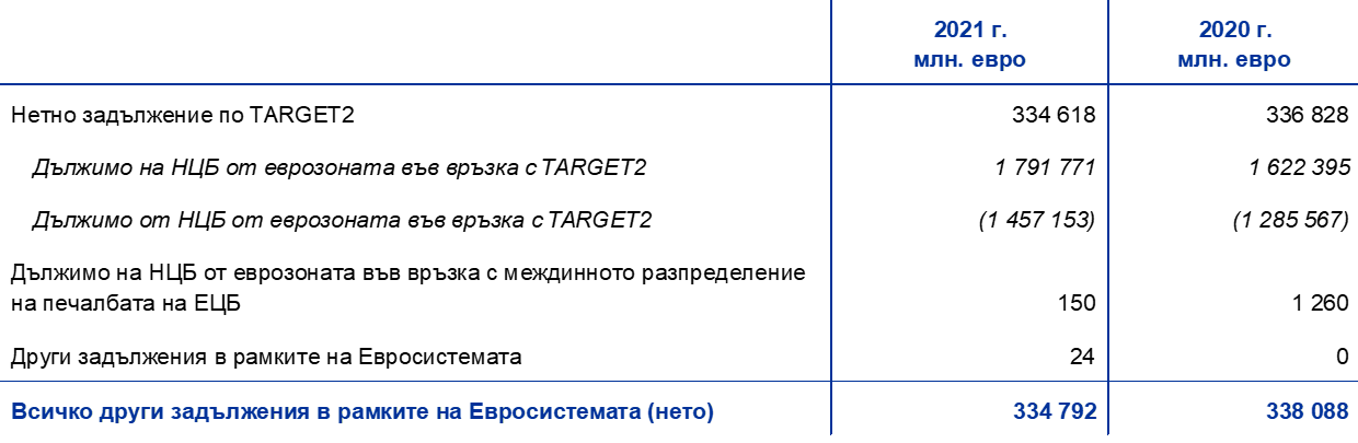 През 2021 г. въздействието на покупките на ценни книжа за целите на паричната политика върху нетното задължение в TARGET2 беше неутрализирано напълно, предимно от по-високите депозити на клиенти на ЕЦБ извън еврозоната в TARGET2 и резиденти извън еврозоната, приети от ЕЦБ в ролята ѝ на фискален агент, както и от увеличението на паричните средства, получени като обезпечение по операции за предоставяне в заем на ценни книжа.