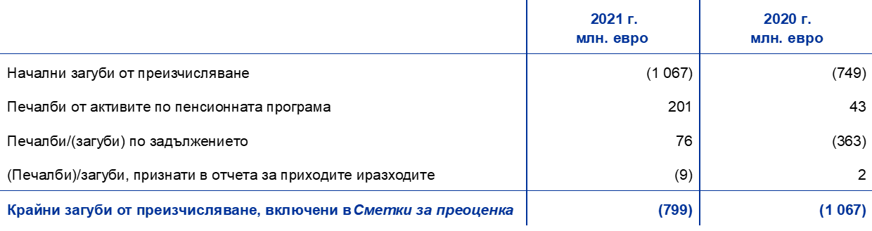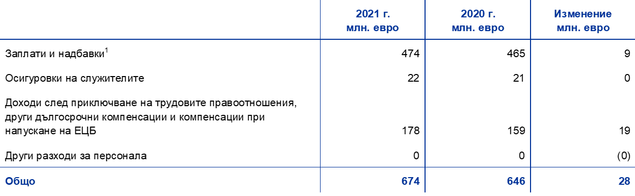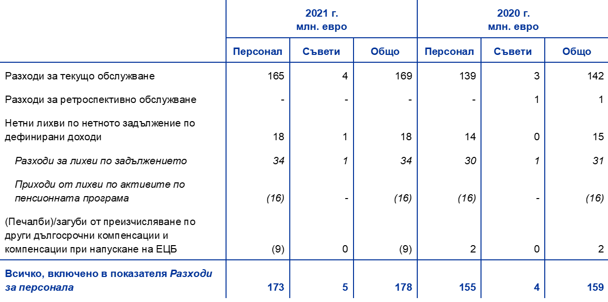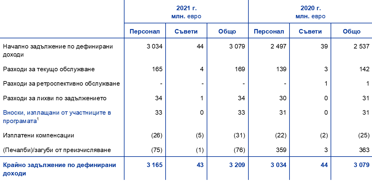 - Стълбът на дефинирани доходи в пенсионната програма отразява само задължителните вноски от ЕЦБ и служителите. Доброволните вноски на служителите в стълба на дефинирани вноски са в размер на 220 млн. евро през 2021 г. (спрямо 186 млн. евро през 2020 г.). Тези вноски са инвестирани в активите по пенсионната програма и пораждат съответстващо задължение на същата стойност.