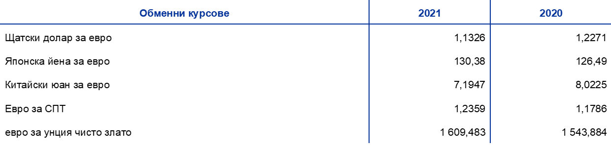 Основни валутни курсове и цена на златото през периода 2017–2021 г.