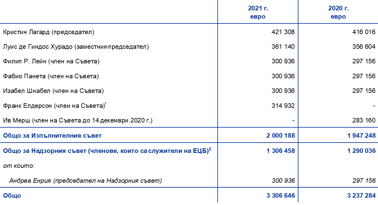 - Относно нетната сума, записана в отчета за приходите и разходите във връзка с пенсиите на сегашните членове на Изпълнителния съвет и сегашните членове на Надзорния съвет, които са служители на ЕЦБ, вижте приложение 13.3 Други.