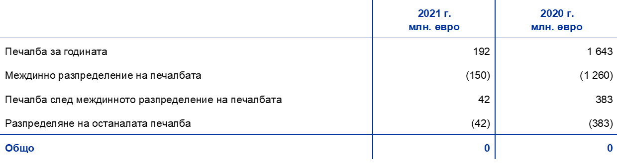 Нетната печалба на ЕЦБ за 2021 г. възлиза на 192 млн. евро. Съгласно решение на Управителния съвет на 31 януари 2022 г. се извърши междинно разпределение на печалбата на стойност 150 млн. евро между НЦБ от еврозоната. Освен това Управителният съвет взе решение да разпредели между НЦБ от еврозоната оставащата печалба в размер на 42 млн. евро.