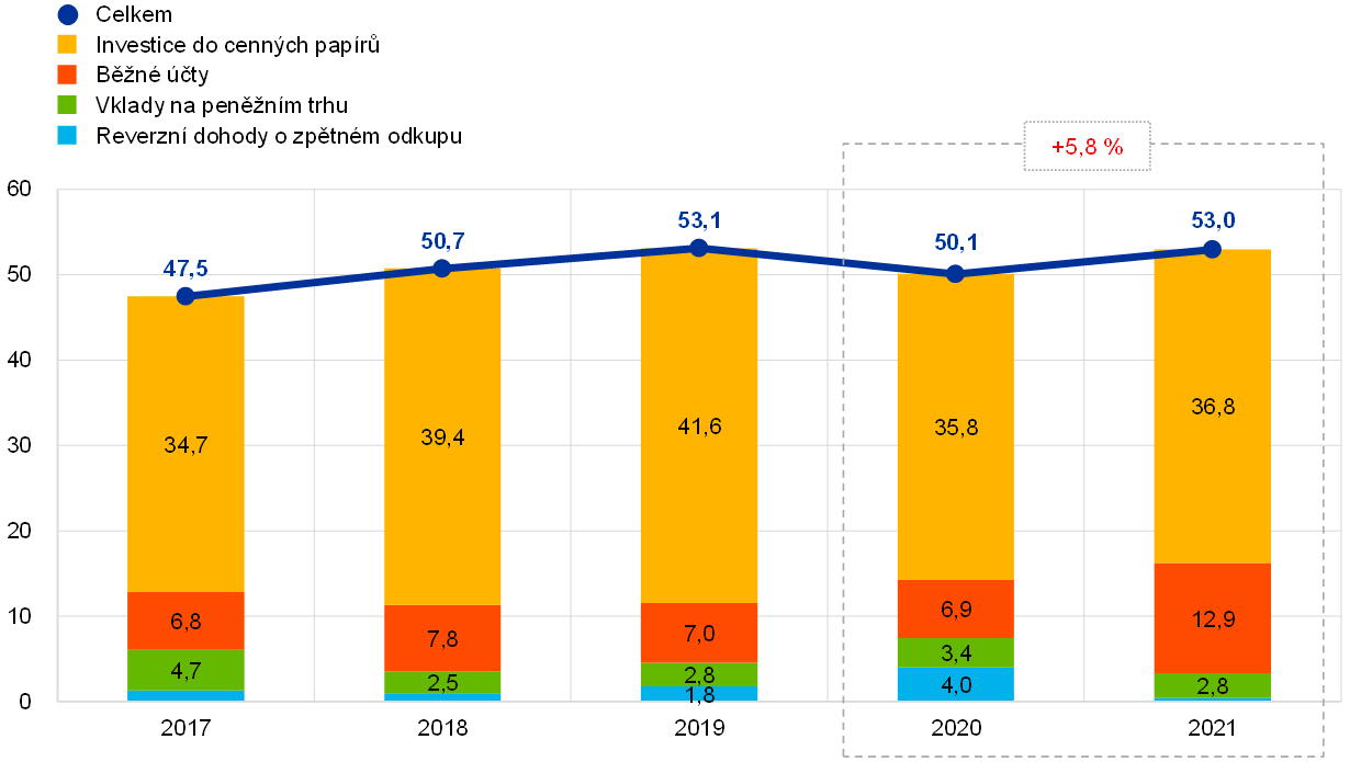 V roce 2021 zaznamenala hodnota portfolia vlastních zdrojů nárůst o 0,4 mld. EUR na 21,1 mld. EUR (graf 8), a to především v důsledku investice částek splacených národními centrálními bankami zemí eurozóny v roce 2021 v rámci první splátky jejich zvýšených úpisů základního kapitálu ECB po vystoupení Bank of England z ESCB (viz část 1.3.2 „finanční zdroje“). Tento nárůst byl částečně kompenzován především poklesem tržní hodnoty cenných papírů držených v portfoliu vlastních zdrojů.