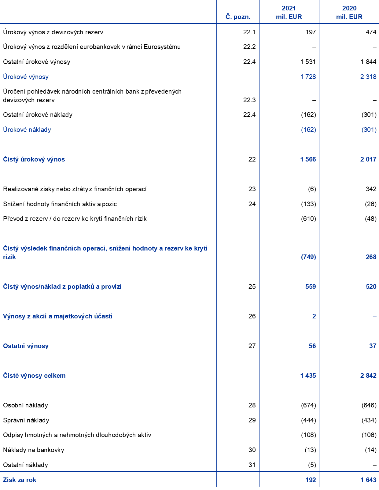 V roce 2021 dosáhl zisk ECB 192 mil. EUR (1 643 mil. EUR v roce 2020). Pokles o 1 452 mil. EUR oproti roku 2020 byl způsoben především nižším čistým výsledkem finančních operací, snížení hodnoty a rezerv ke krytí rizik, konkrétně v důsledku převodu do rezervy ke krytí finančních rizik a nižších čistých úrokových výnosů (graf 13).