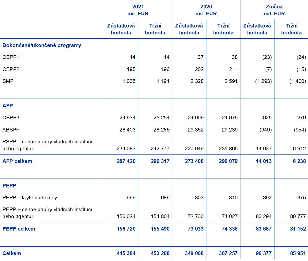 Na základě příslušných rozhodnutí Rady guvernérů pokračovala ECB v roce 2021 ve svých čistých nákupech cenných papírů v rámci APP a PEPP včetně reinvestování jistin ze splatných cenných papírů zakoupených v rámci těchto programů. V důsledku těchto nákupů se portfolio cenných papírů držených ECB pro účely měnové politiky zvýšilo o 96,4 mld. EUR na 445,4 mld. EUR (graf 2), přičemž většinu tohoto nárůstu představují nákupy v rámci PEPP. Pokles 1,3 mld. EUR v rámci SMP, CBPP1 a CBPP2 byl způsoben splacením cenných papírů.