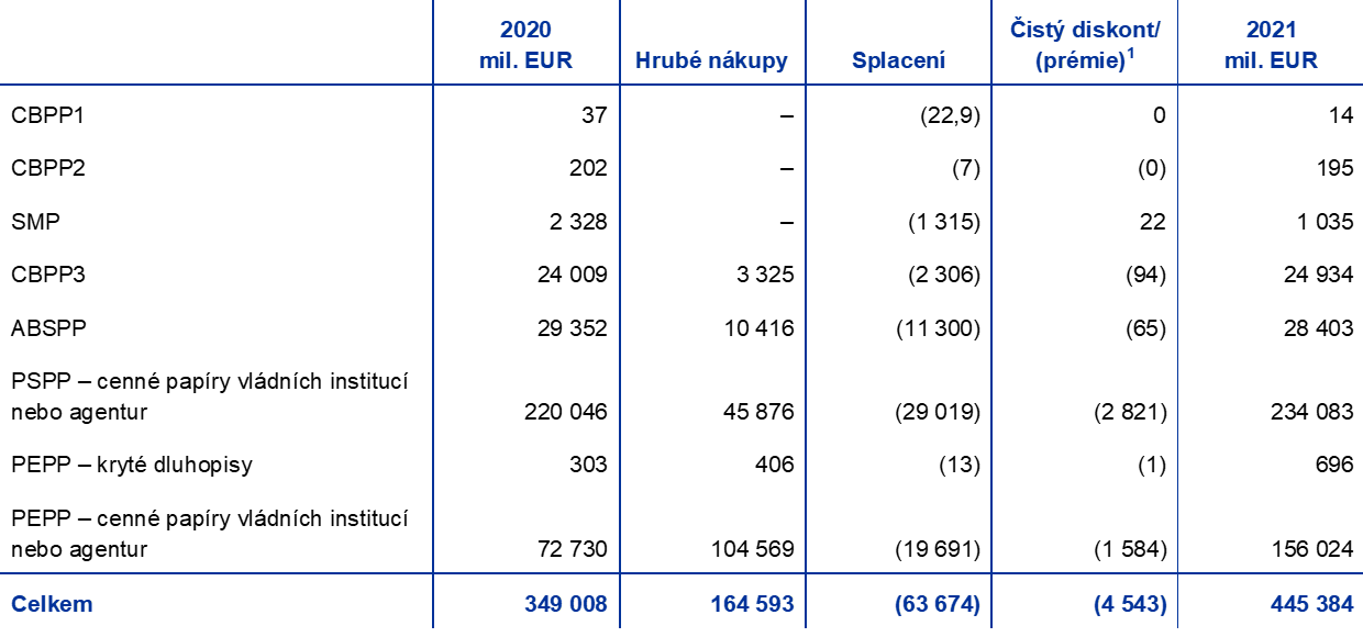 V prosinci 2021 Rada guvernérů oznámila[8], že měsíční objem čistých nákupů v rámci APP zvýší ve druhém čtvrtletí roku 2022 na 40 mld. EUR a ve třetím čtvrtletí na 30 mld. EUR. Počínaje říjnem 2022 budou čisté nákupy aktiv udržovány v měsíčním objemu 20 mld. EUR po dobu nezbytně nutnou k podpoření akomodačního dopadu sazeb měnové politiky ECB a budou ukončeny krátce před tím, než Rada guvernérů zahájí zvyšování základních úrokových sazeb ECB. Rada guvernérů se dále rozhodla ukončit čisté nákupy aktiv v rámci PEPP na konci března 2022. Tyto nákupy by se však mohly v případě potřeby obnovit, aby pomohly čelit negativním šokům spojeným s pandemií. V souladu s rozhodnutím Rady guvernérů bude Eurosystém nadále v plném rozsahu reinvestovat jistiny ze splatných cenných papírů zakoupených v rámci APP a PEPP.