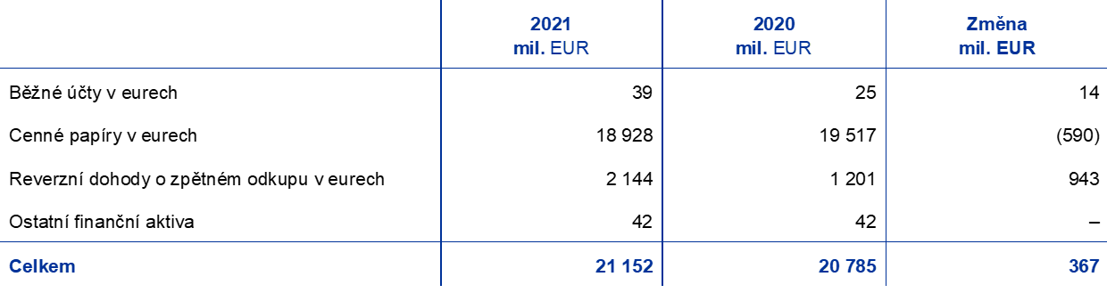 - Tato aktiva jsou zahrnuta pod rozvahovými položkami „pohledávky v cizí měně za nerezidenty eurozóny – zůstatky u bank a investice do cenných papírů, zahraniční půjčky a jiná zahraniční aktiva“ a „pohledávky v cizí měně za rezidenty eurozóny“.