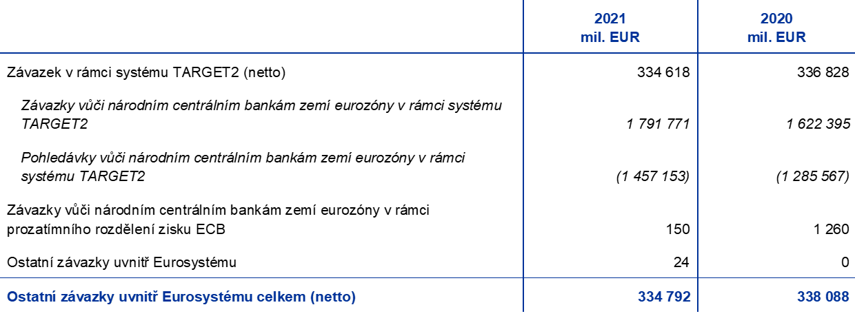 Závazky ECB uvnitř Eurosystému, jež zahrnují zejména čisté zůstatky v systému TARGET2, které národní centrální banky států eurozóny mají u ECB, a závazky ECB, pokud jde o devizové rezervy, které na ni převedly národní centrální banky eurozóny po vstupu do Eurosystému, poklesly v roce 2021 o 3,3 mld. EUR na 375,1 mld. EUR. Vývoj závazků uvnitř Eurosystému v období let 2017 až 2020 byl způsoben především vývojem čistého závazku v rámci systému TARGET2 v důsledku toho, že ECB uskutečnila čisté nákupy cenných papírů držených pro účely měnové politiky, které jsou vypořádány prostřednictvím účtů TARGET2 (graf 10).