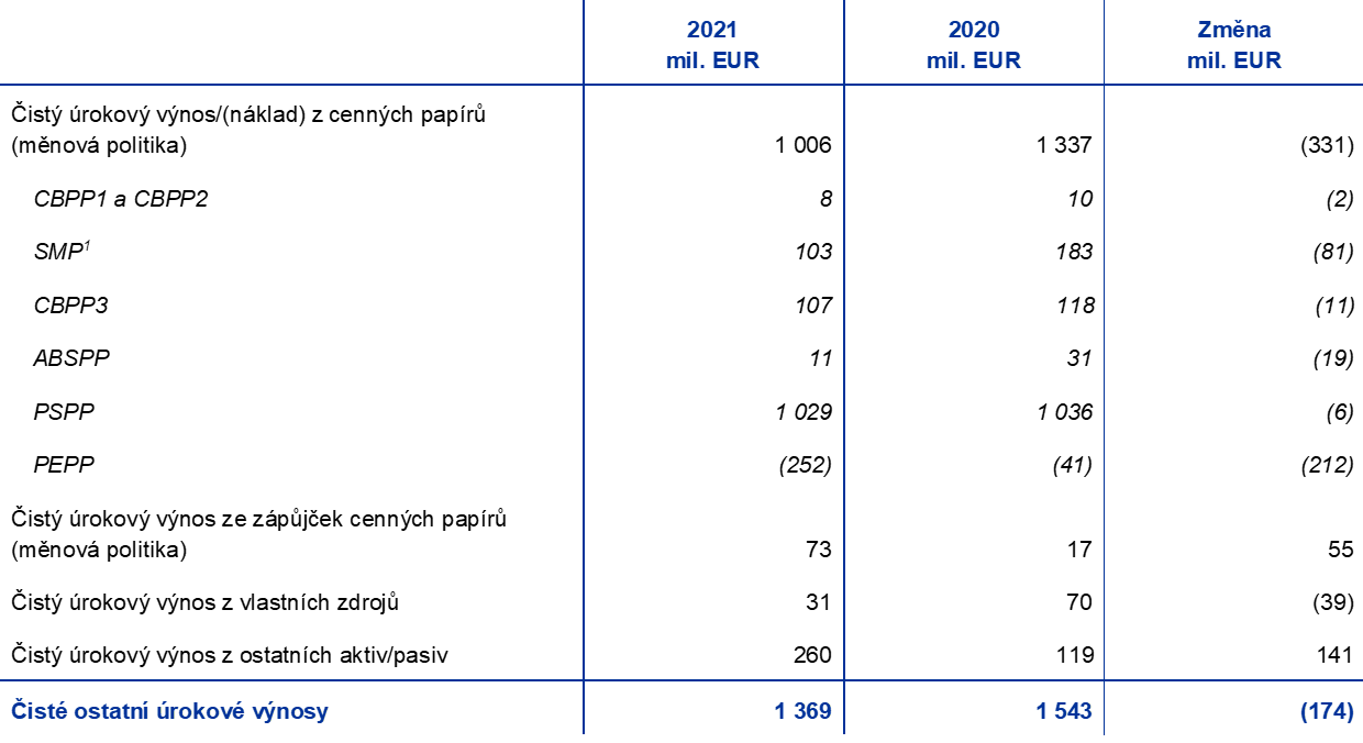 V roce 2021 představovaly cenné papíry držené pro účely měnové politiky 64 % čistého úrokového výnosu ECB.