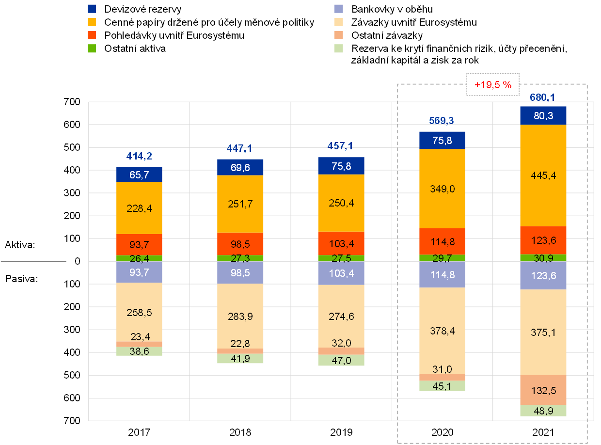 V roce 2021 došlo k nárůstu rozvahy ECB o 110,8 mld. EUR na 680,1 mld. EUR, zejména díky podílu ECB na nákupech cenných papírů v rámci PEPP a APP. Tyto nákupy vedly k růstu v položce „cenné papíry držené pro účely měnové politiky“ a současně hotovostní vypořádání těchto nákupů prostřednictvím účtů TARGET2 vedlo k odpovídajícímu nárůstu v položce „závazky uvnitř Eurosystému“. Nad nárůstem v položce „závazky uvnitř Eurosystému“ převážil příjem hotovosti od klientů ECB v systému TARGET2 mimo eurozónu, výsledkem čehož byl také nárůst v položce „ostatní závazky“.