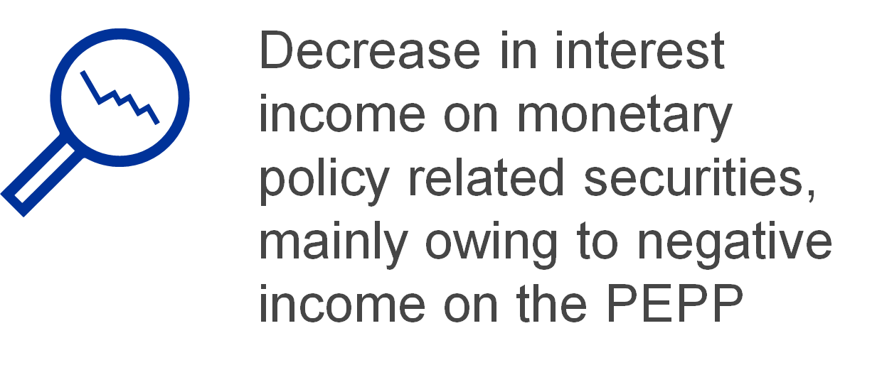 The net interest income of the ECB decreased by €451 million to €1,566 million (Chart 14) owing to lower interest income earned on securities held for monetary policy purposes and on foreign reserve assets. The increase in net other interest income only partially compensated for these decreases.