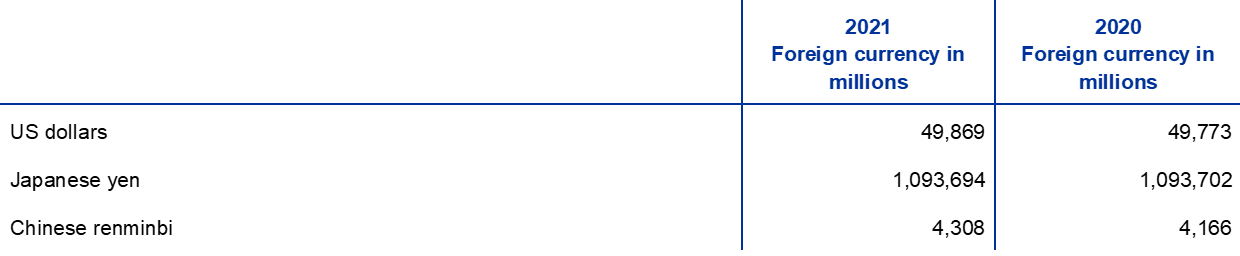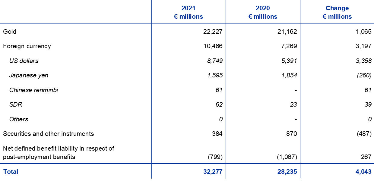 In 2021 the total euro equivalent value of the ECB’s foreign reserve assets, which consist of gold, special drawing rights, US dollars, Japanese yen and Chinese renminbi, increased by €4.5 billion to €80.3 billion.