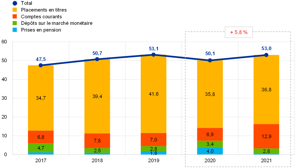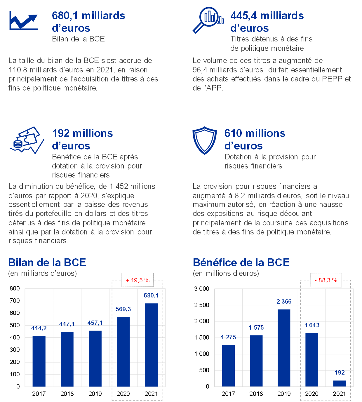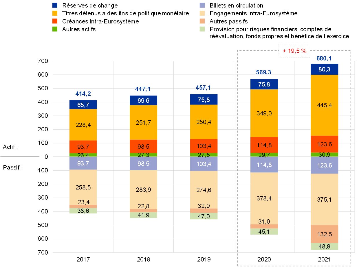 En 2021, la taille du bilan de la BCE s’est accrue de 110,8 milliards d’euros, à 680,1 milliards d’euros, du fait essentiellement de la part de la BCE dans les achats de titres effectués dans le cadre du PEPP et de l’APP. Ces achats se sont traduits par une hausse des titres détenus à des fins de politique monétaire, alors que leur règlement en espèces à travers les comptes TARGET2 a entraîné une augmentation correspondante des engagements intra-Eurosystème. Cette augmentation des engagements intra-Eurosystème a été plus que compensée par les espèces reçues des clients TARGET2 de la BCE n’appartenant pas à la zone euro, ce qui a également provoqué une hausse des autres engagements.