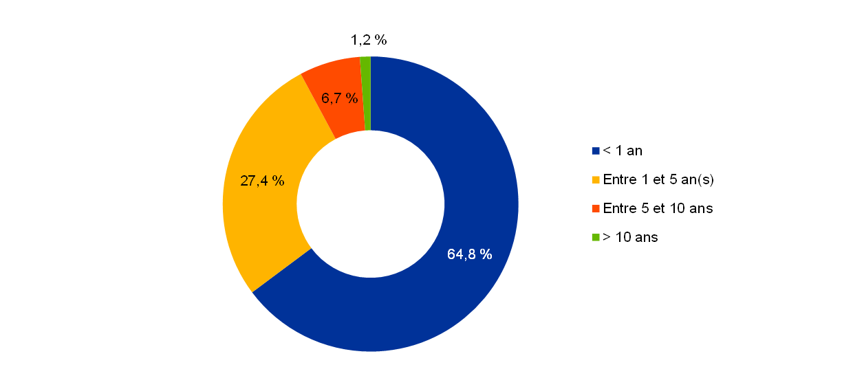 Le portefeuille de fonds propres de la BCE comprend principalement le placement des ressources financières de la BCE, à savoir son capital libéré, les montants détenus dans le fonds de réserve générale et la provision pour risques financiers. En raison du réinvestissement des produits et de la valorisation des titres aux prix du marché, les montants du portefeuille de fonds propres et des ressources financières mentionnées précédemment ne correspondent pas forcément. Ce portefeuille vise à fournir une source de revenus contribuant à couvrir les charges d’exploitation de la BCE non liées à l’exécution des missions de surveillance prudentielle[11]. Il est investi dans des avoirs libellés en euros, dans la limite imposée par le dispositif de contrôle des risques. Il en résulte une structure d’échéances plus diversifiée (graphique 9) que celle du portefeuille des réserves de change.