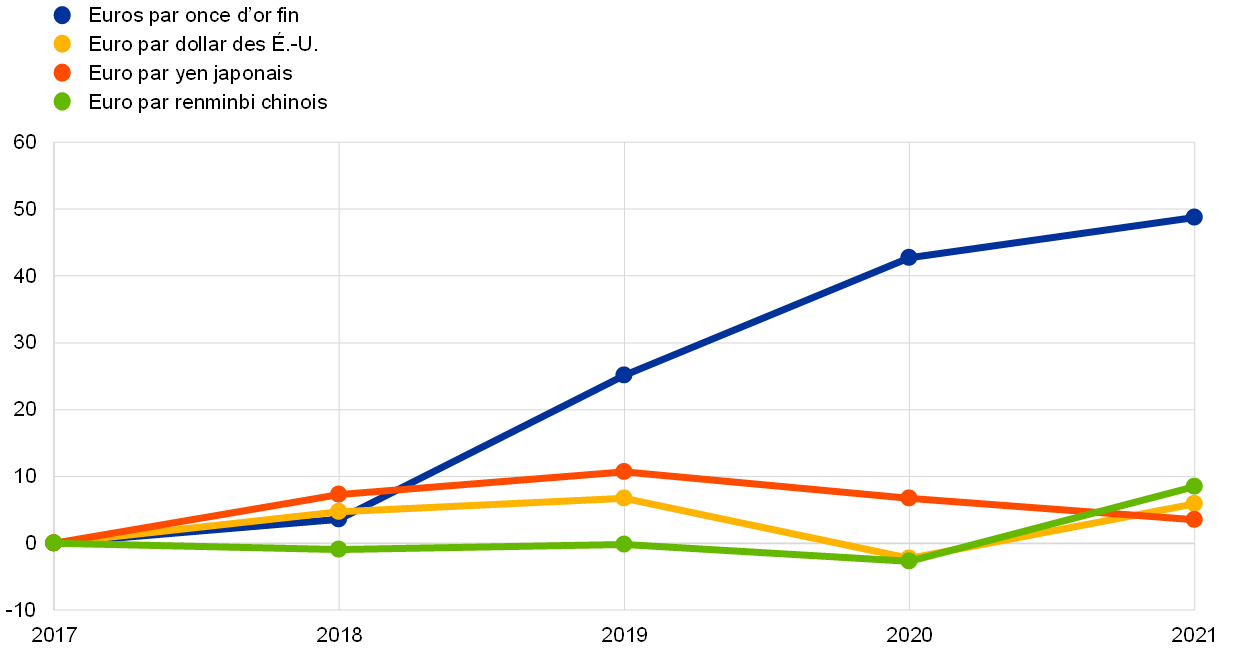 La contre-valeur en euros des avoirs et des créances en or de la BCE a enregistré une hausse de 1,1 milliard d’euros, à 26,1 milliards d’euros, en 2021 (graphique 4), en raison d’une hausse du prix de marché, exprimé en euros, de l’or, alors que le volume de ces avoirs (exprimé en onces d’or fin) est resté inchangé. Cette progression a aussi entraîné un accroissement, du même montant, des comptes de réévaluation de l’or de la BCE (cf. section 1.3.2 « Ressources financières »).