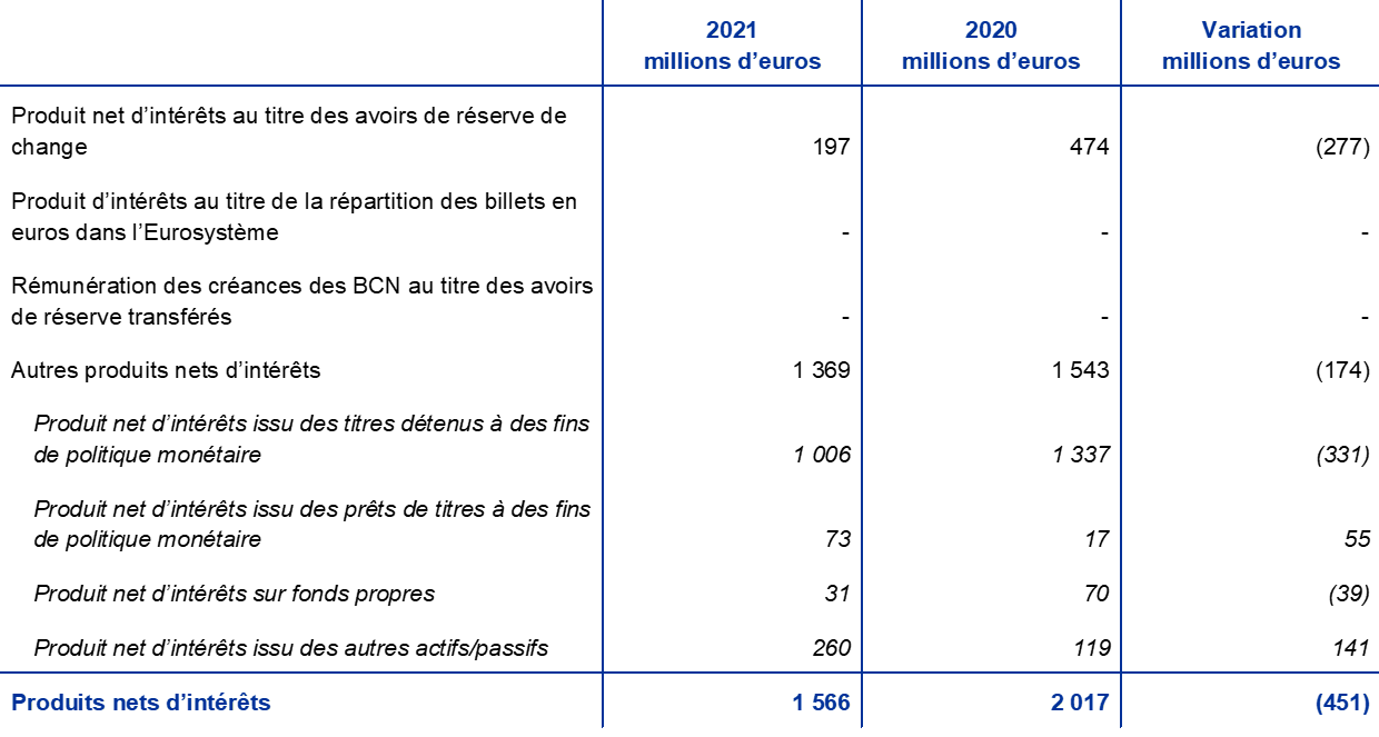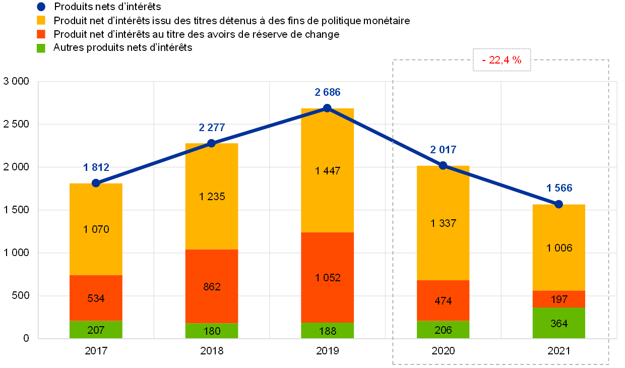 Les produits nets d’intérêts de la BCE ont diminué de 451 millions d’euros, à 1 566 millions d’euros (graphique 14), du fait de la baisse des revenus d’intérêts tirés des titres détenus à des fins de politique monétaire et des avoirs de réserve de change. La hausse des autres produits nets d’intérêts n’a que partiellement compensé ces baisses.