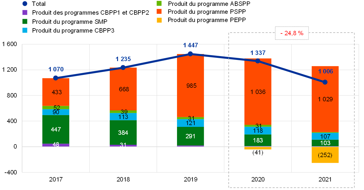 En 2021, les titres détenus à des fins de politique monétaire ont été à l’origine de 64 % des produits nets d’intérêts de la BCE.